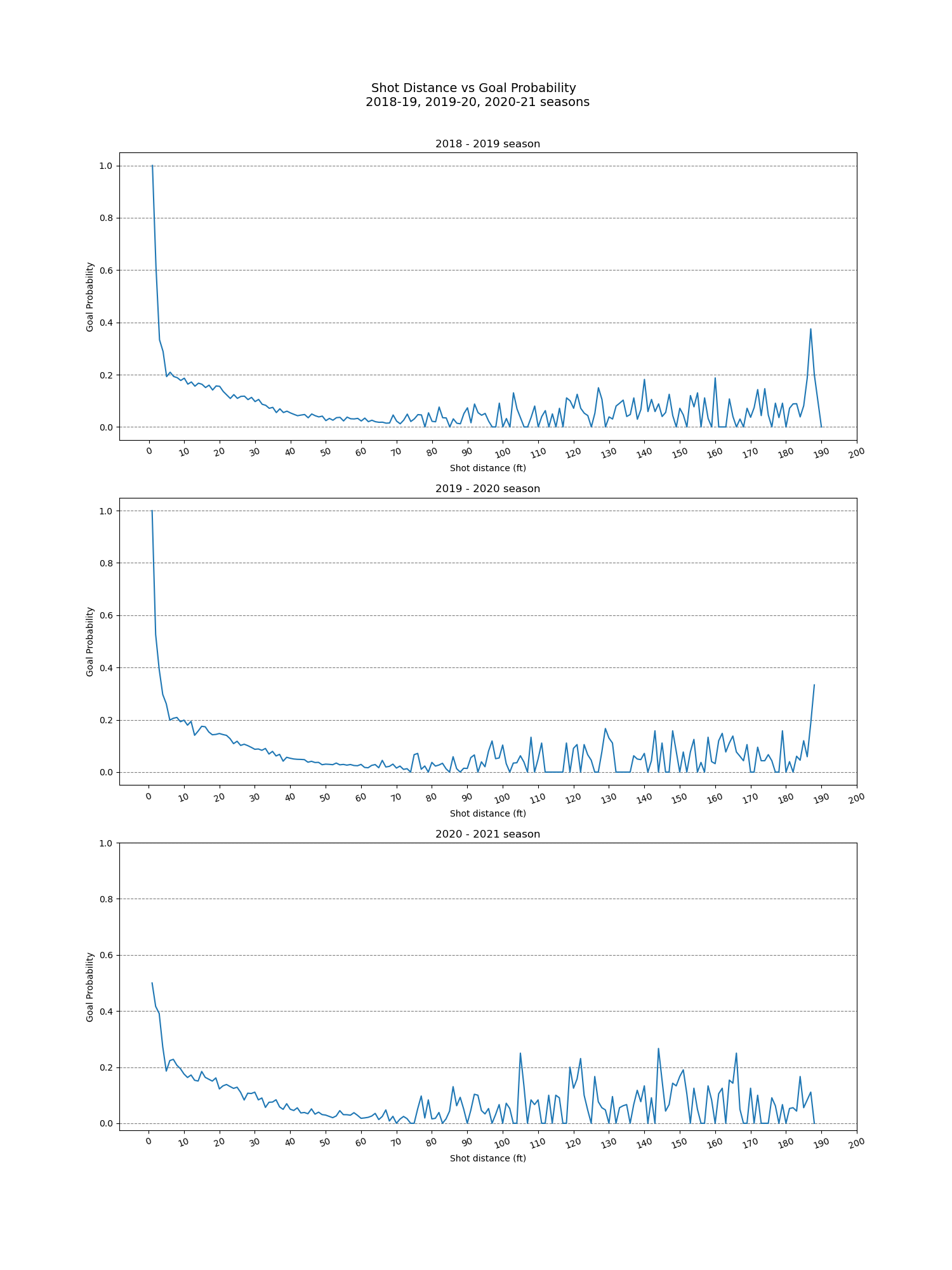 By comparing the 3 graphs and focusing our analysis on shots from less than 100 ft for the reason stated above, we can see that results by year are pretty stable. This is due to a consistent ruleset in the past couple years. If some rule changes happened giving goalers smaller equipment on widening the net we might’ve seen a distribution shift in our figures.
